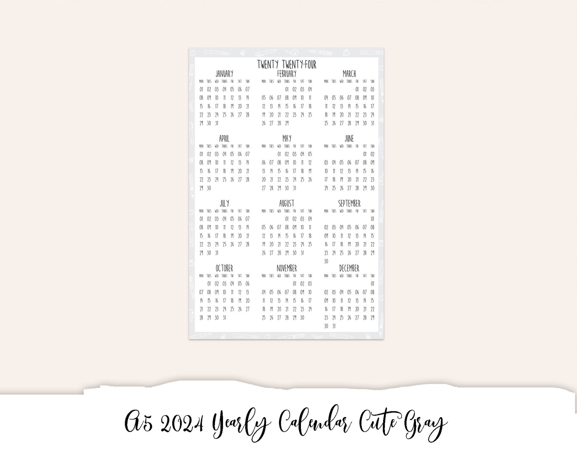 A5 2024 Yearly Calendar Cute Gray (Full Page Printable Stickers)