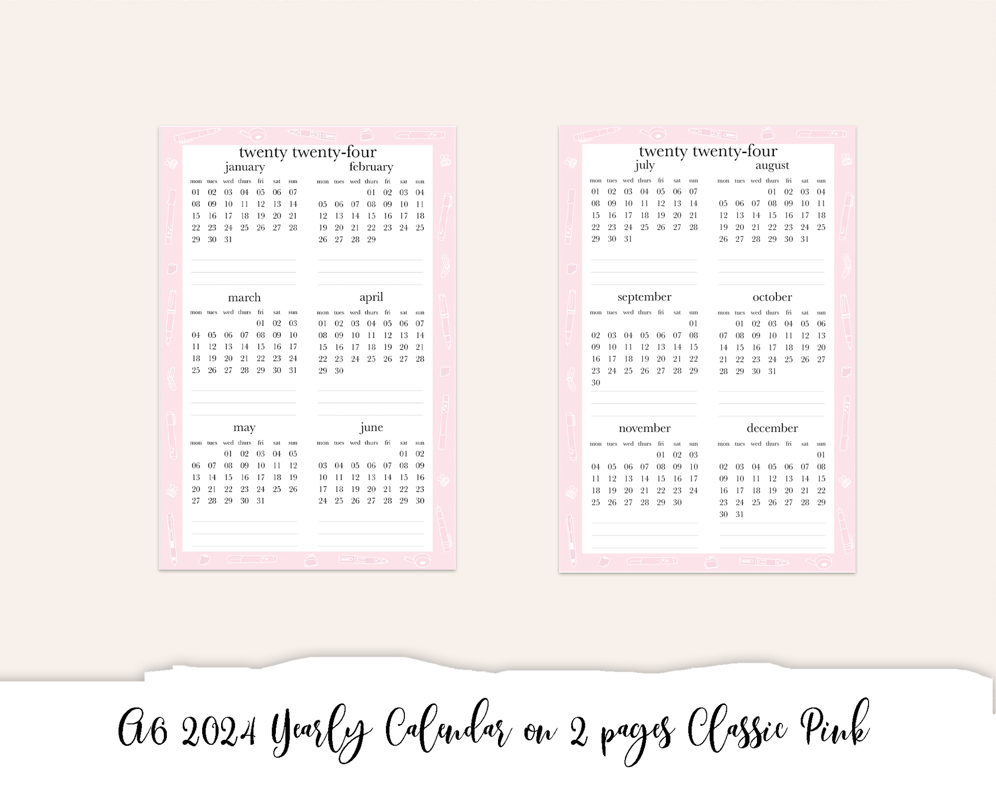 A6 2024 Yearly Calendar on 2 pages Classic Pink (Full Page Printable Stickers)