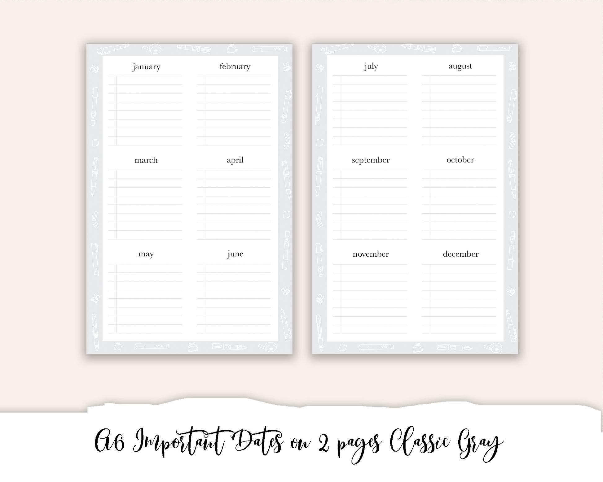 A6 Hobonichi Important Dates on 2 Pages Classic Gray (Full Page Printable Stickers)
