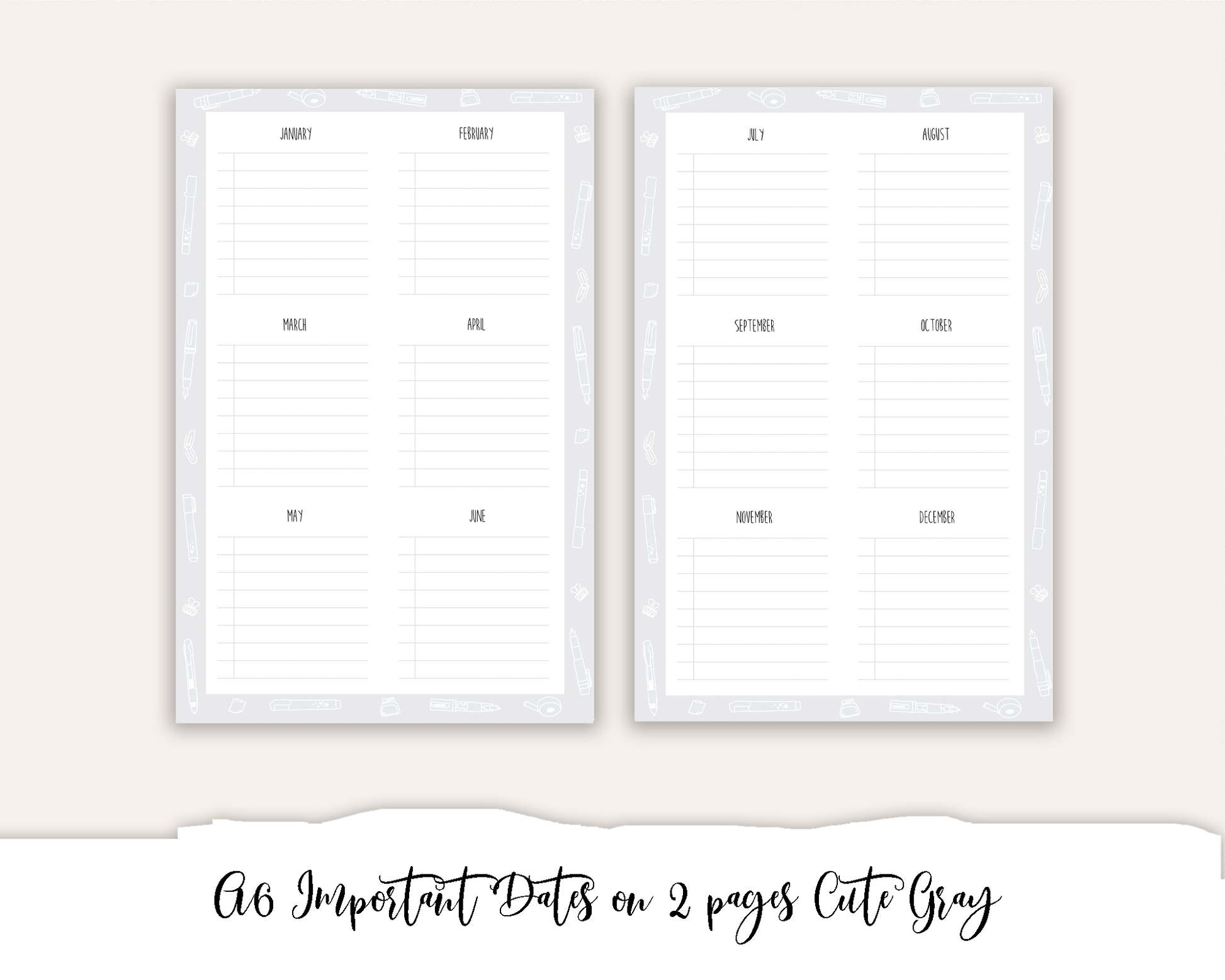 A6 Hobonichi Important Dates on 2 Pages Cute Gray (Full Page Printable Stickers)