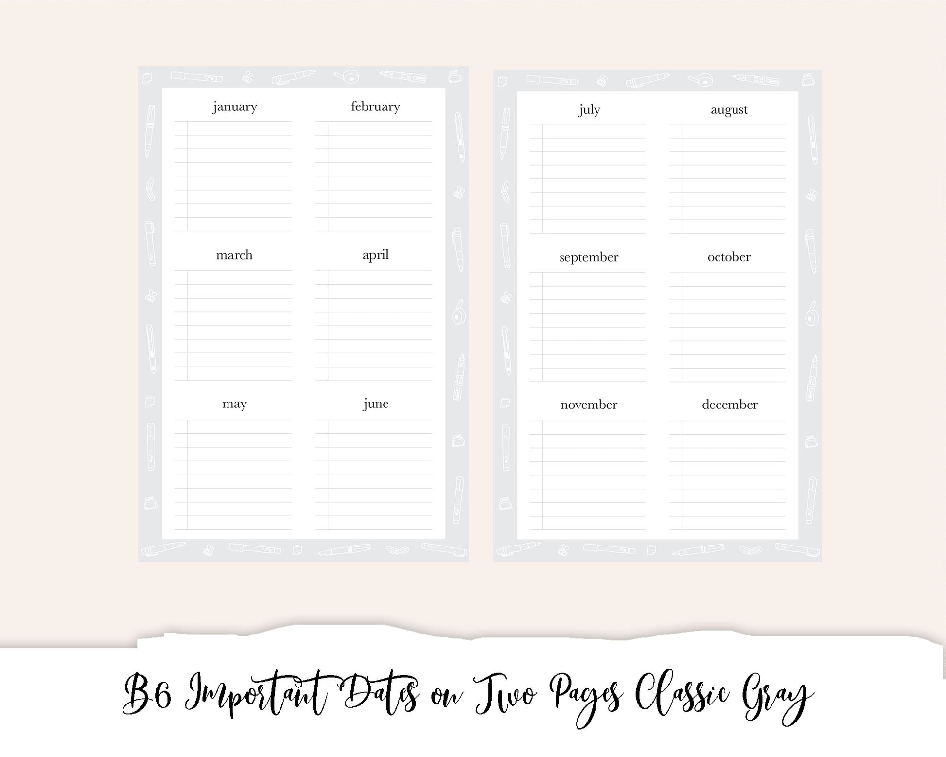 B6 Important Dates on 2 Pages Classic Gray (Full Page Printable Stickers)