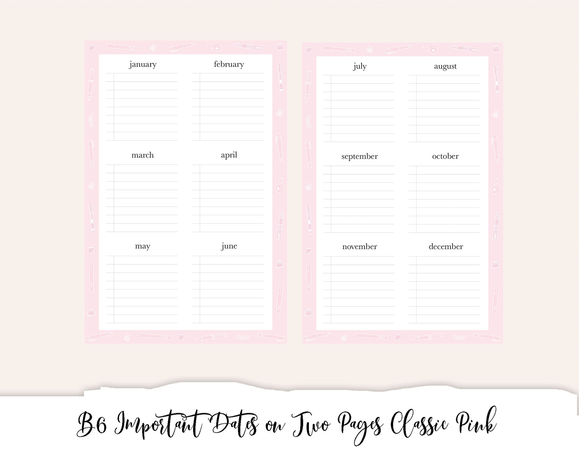 B6 Important Dates on 2 Pages Classic Pink (Full Page Printable Stickers)