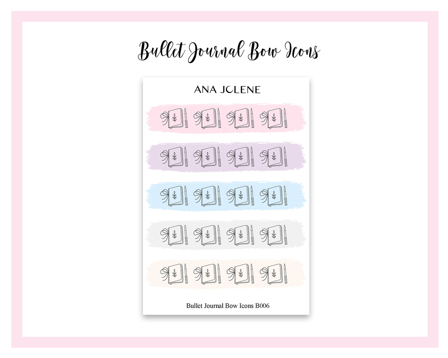 Includes one page of bow icons stickers of your choice for planners and bullet journals. Printed on permanent matte sticker paper. Icons come in five colors - light pink, light purple, light blue, light gray and light beige to match with all your planner spreads. Please see photos for what the icons will look like.