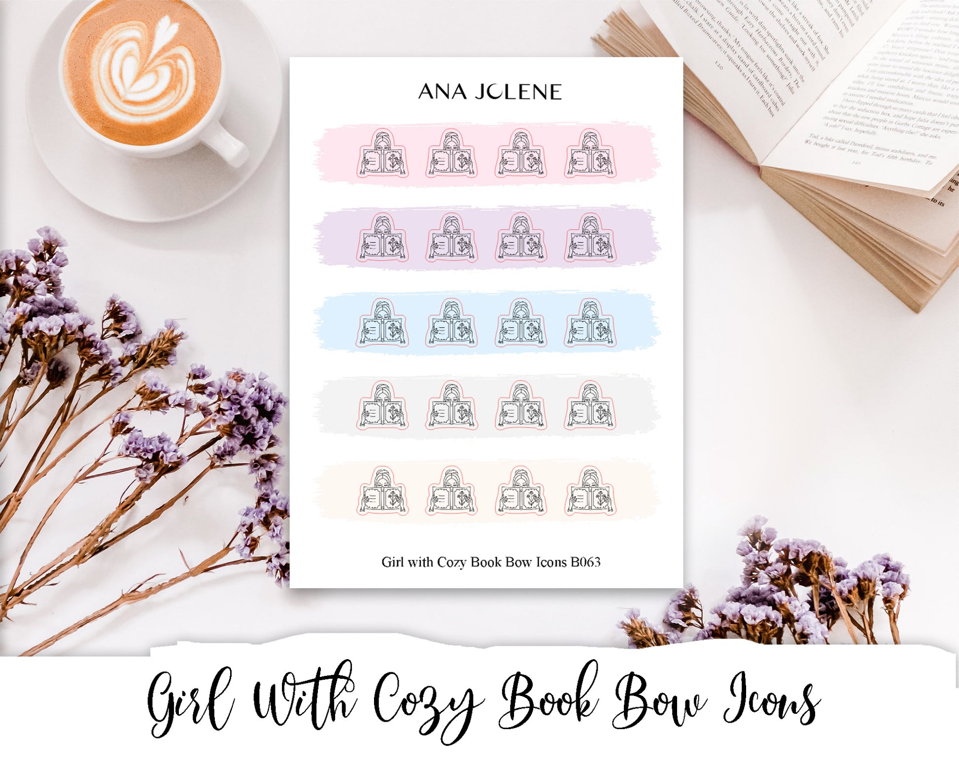 Girl With Cozy Book Bow Icons - Minimal Line Art Bow Icons Stickers for Planners and Bullet Journal