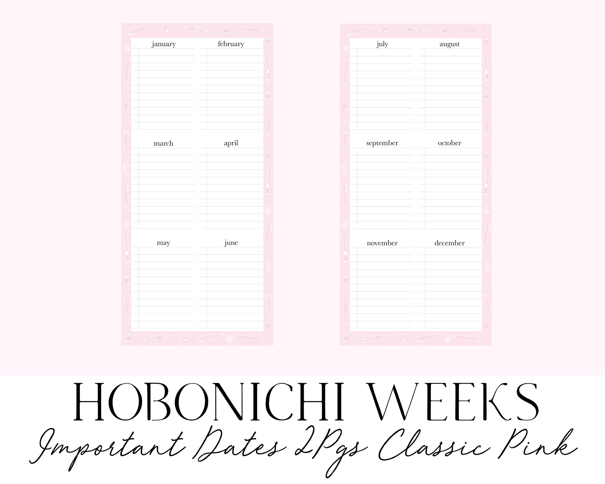 Hobonichi Weeks Important Dates 2 pgs Classic Pink (Full Page Printable Stickers)