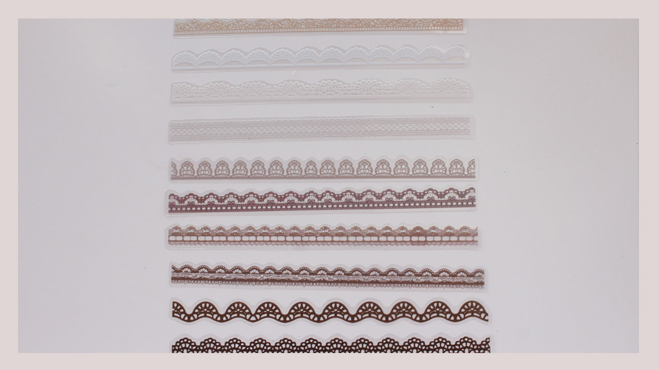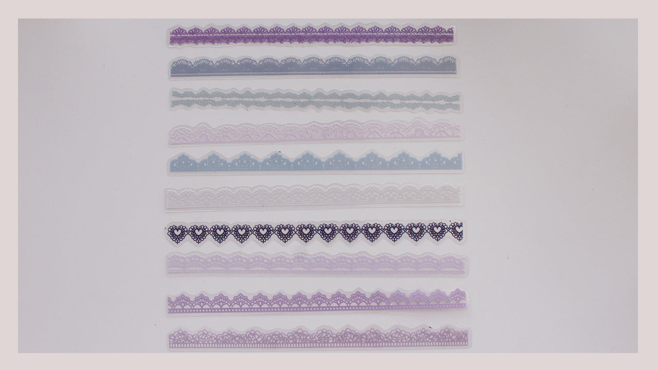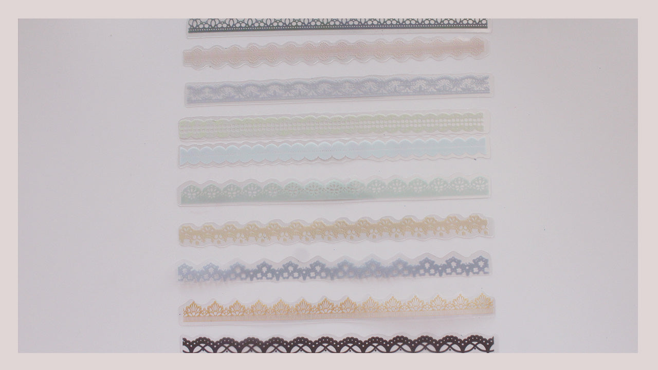 One grab bag of assorted lace PET stickers. Contains 10 strips of various colors. Use in your planning or journaling spreads!