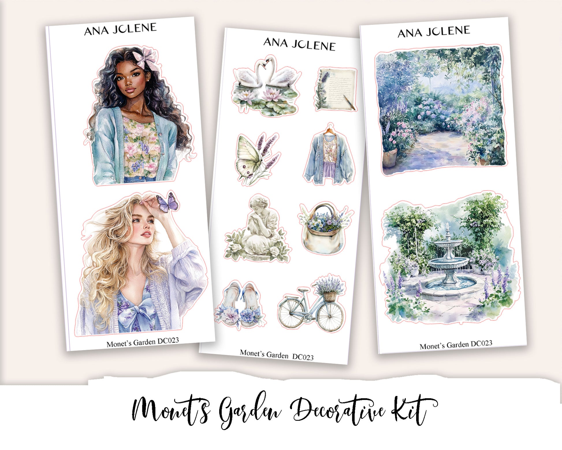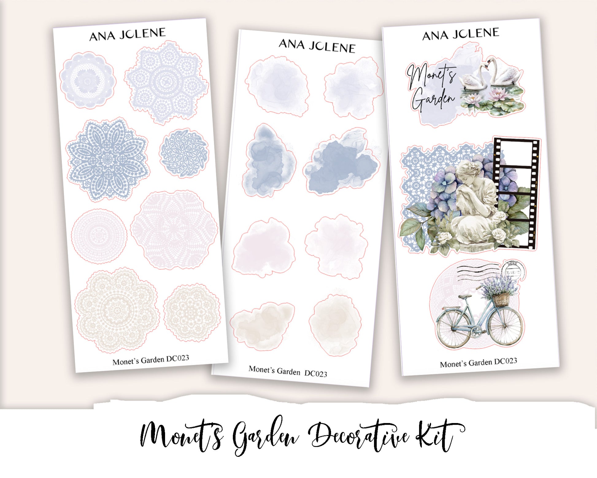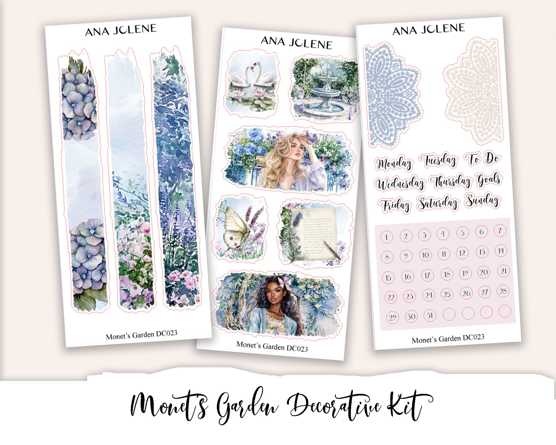 This is a 9 page kit comprising of decorative stickers to use in your planners and journals. Includes various elements such as floral and lace trim, floral bouquets, floral corners, fashion girls, decorative elements and scenes as well as doilies, alcohol ink swatches and collages. Compatible with ALL planners.