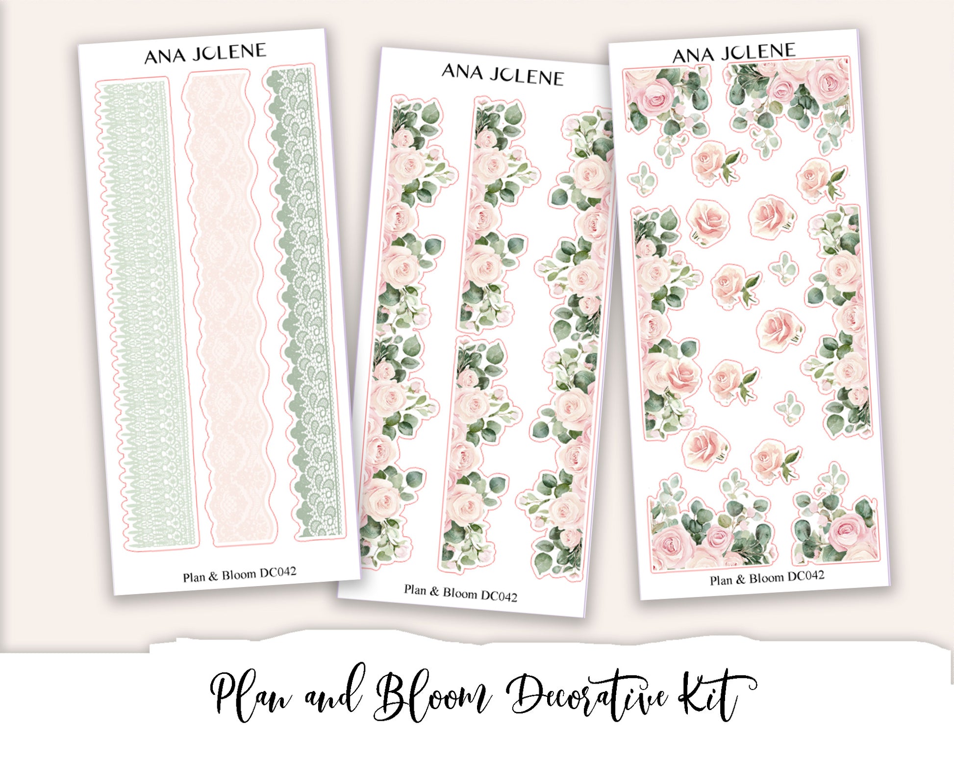 This is a 9 page kit comprising of decorative stickers to use in your planners and journals. Includes various elements such as floral and lace trim, floral bouquets, floral corners, fashion girls, decorative elements and scenes as well as doilies, alcohol ink swatches and collages. Compatible with ALL planners.