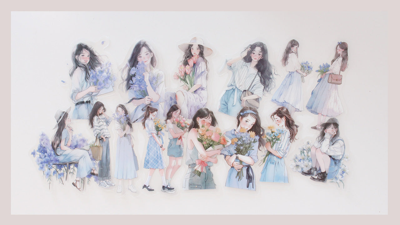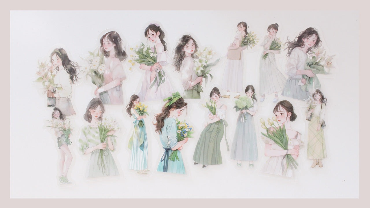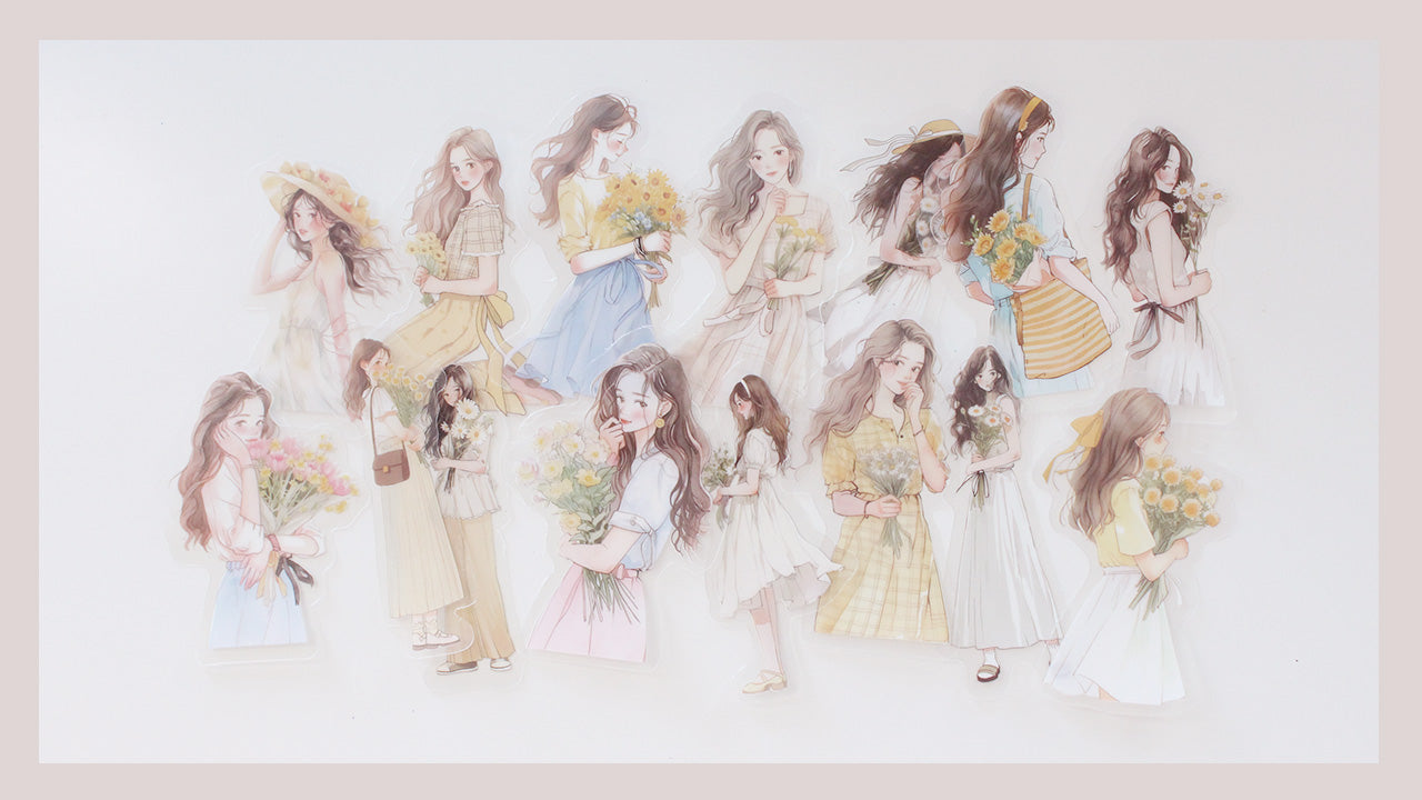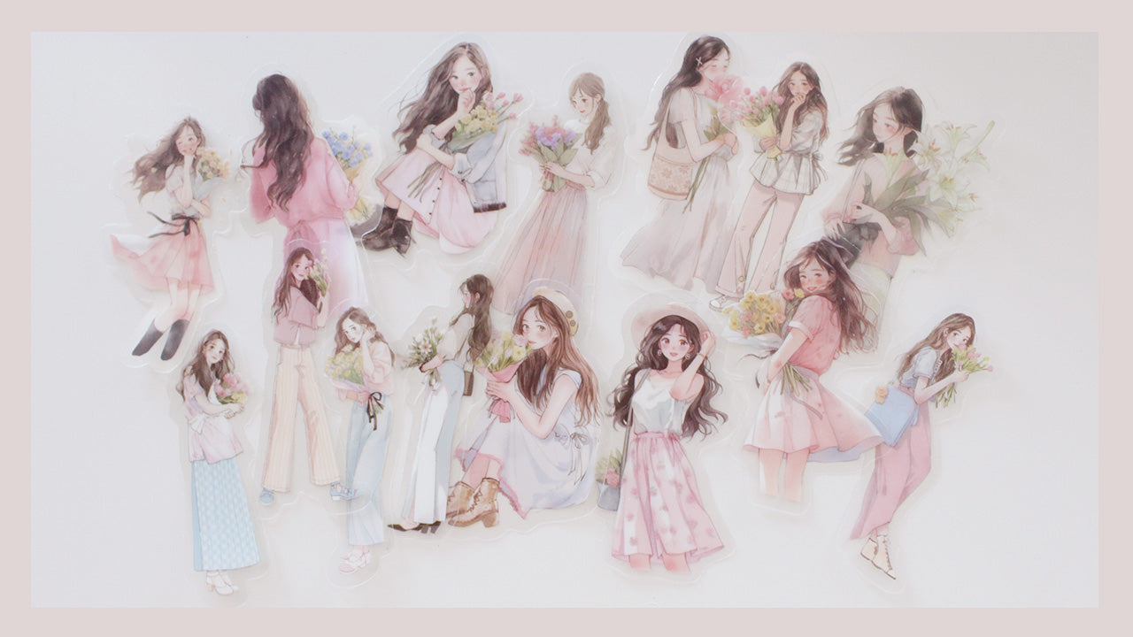 One grab bag of clear PET spring-style fashion girl stickers. Choose between the following colorways: yellow, pink, green and blue. Use in your planning or journaling spreads!
