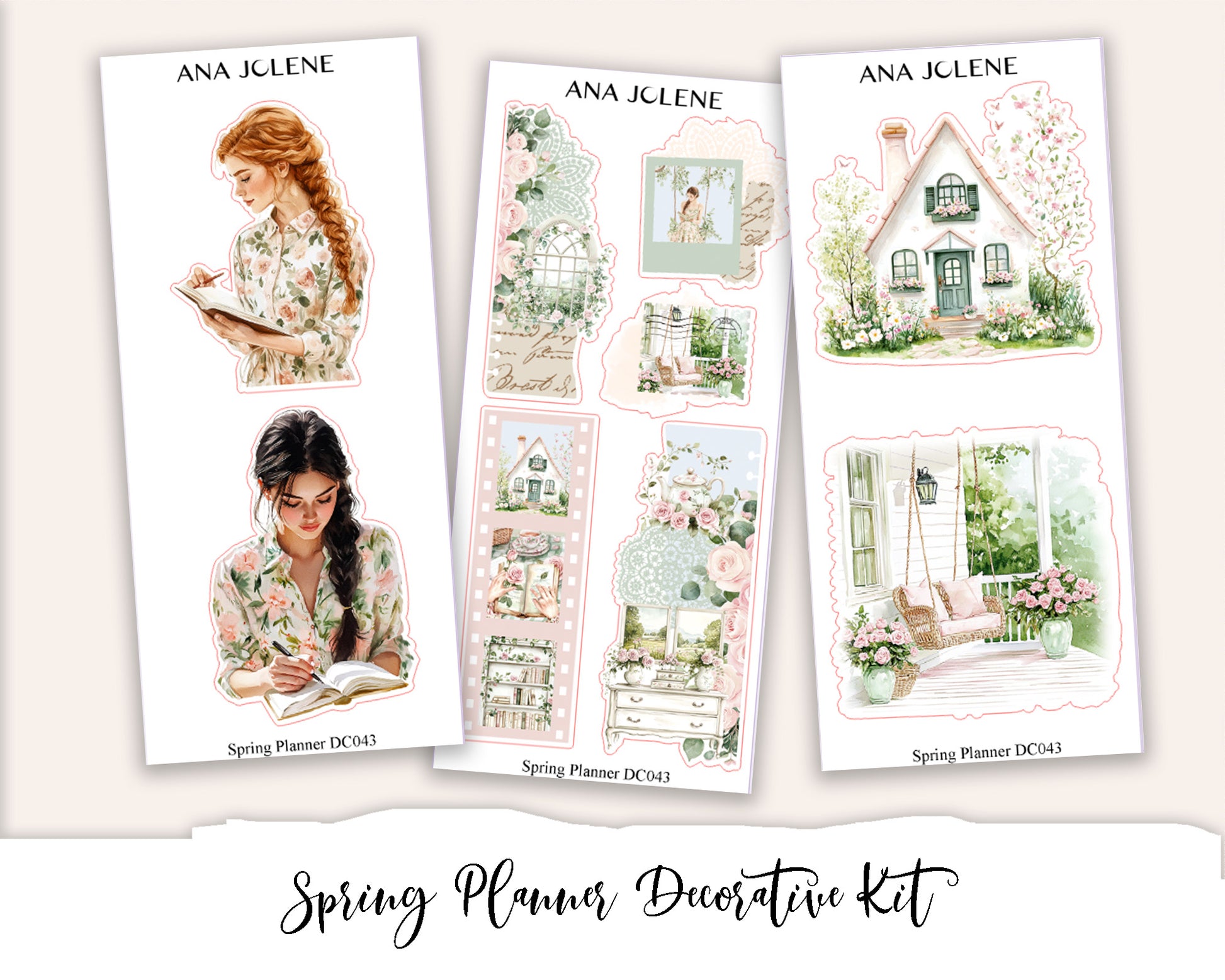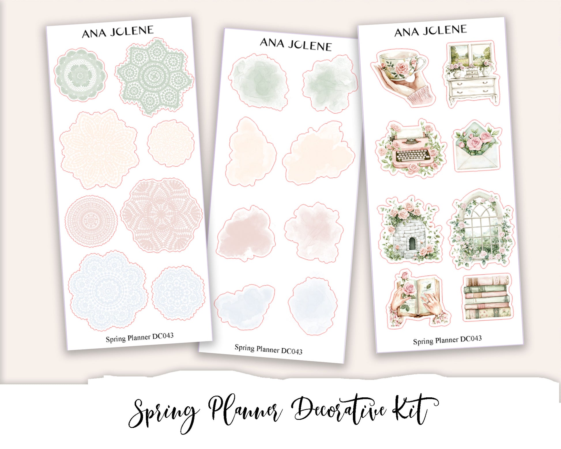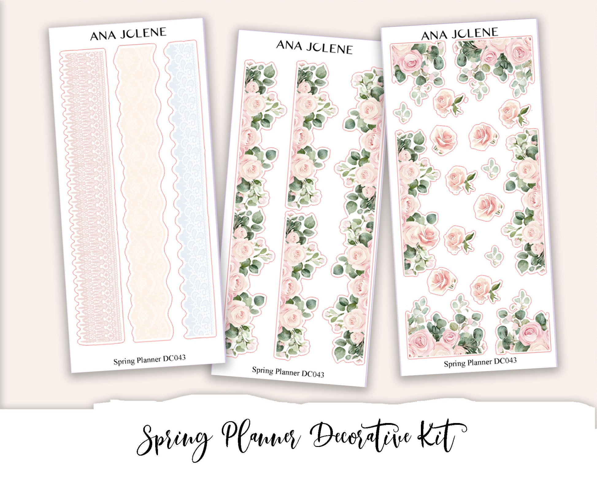 This is a 9 page kit comprising of decorative stickers to use in your planners and journals. Includes various elements such as floral and lace trim, floral bouquets, floral corners, fashion girls, decorative elements and scenes as well as doilies, alcohol ink swatches and collages. Compatible with ALL planners.