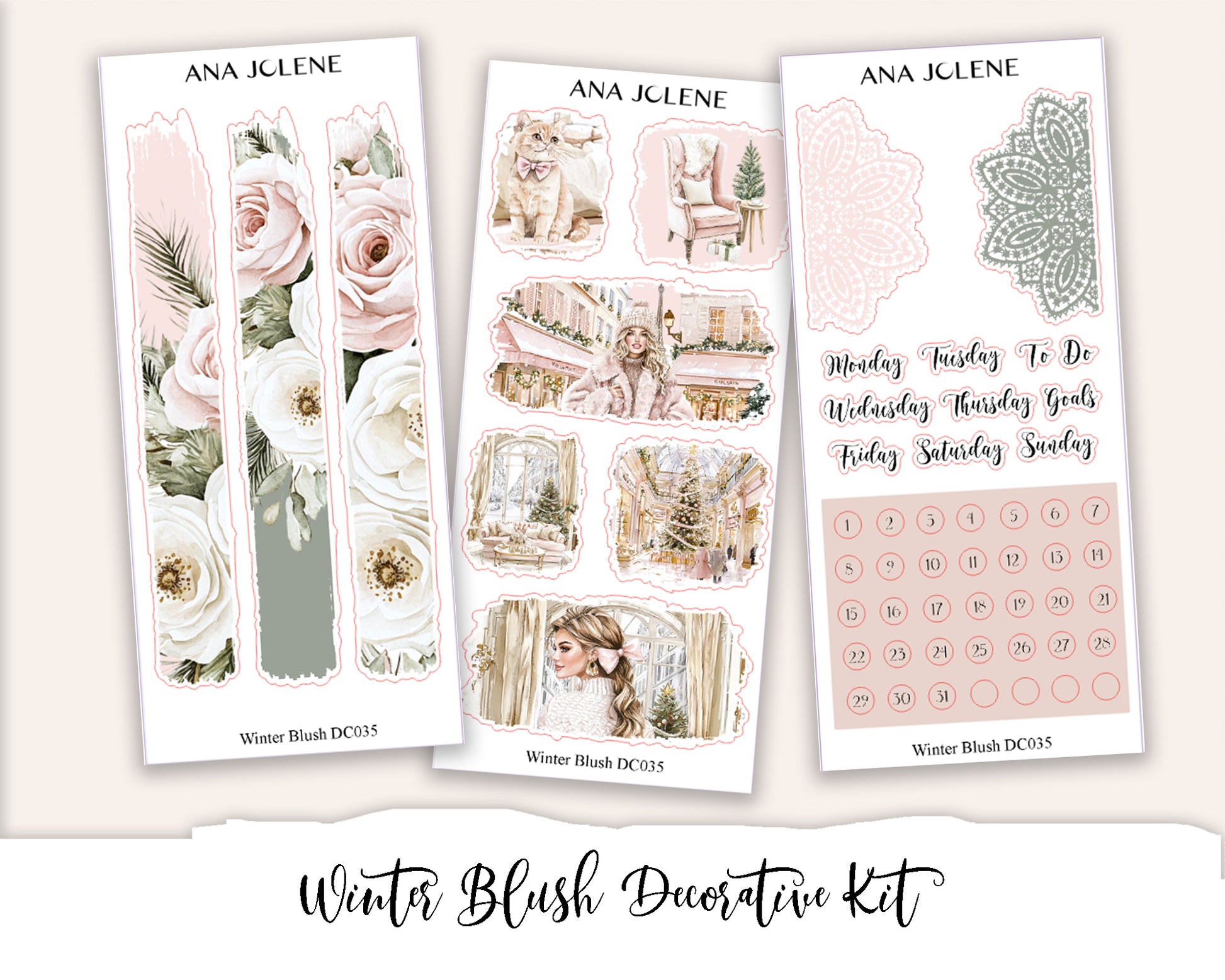 This is a 9 page kit comprising of decorative stickers to use in your planners and journals. Includes various elements such as floral and lace trim, floral bouquets, floral corners, fashion girls, decorative elements and scenes as well as doilies, alcohol ink swatches and collages. Compatible with ALL planners.